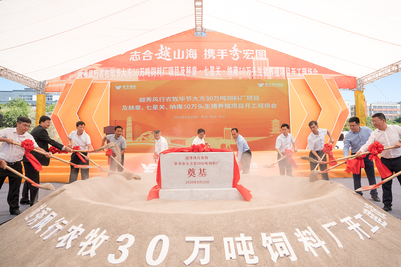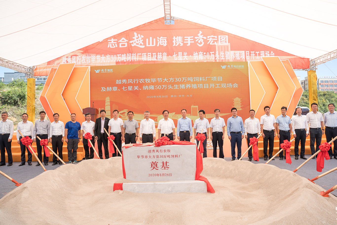 8月26日,越秀集团毕节农牧一体化项目(毕节大方30万吨饲料厂及赫章、七星关、纳雍50万头生猪养殖项目)和毕节产教融合帮扶项目正式开工,贵州省、广州市、毕节市有关领导出席开工仪式。集团党委书记、董事长张招兴,党委副书记、副董事长、总经理叶珊瑚出席上述项目开工仪式,并为项目培土奠基。集团领导伍尚辉、林辉新、韦黎明、王恕慧、林昭远,监事会主席安劲松,外部董事及专职监事出席开工仪式。一天之内5大项目同时开工,不仅标志着越秀集团对口帮扶贵州工作进入新的阶段,也彰显了集团深度参与广州对口帮扶毕节黔南州工作、支持毕节黔南州高质量打赢脱贫攻坚战和助推当地经济社会高质量发展的坚定信心和决心。