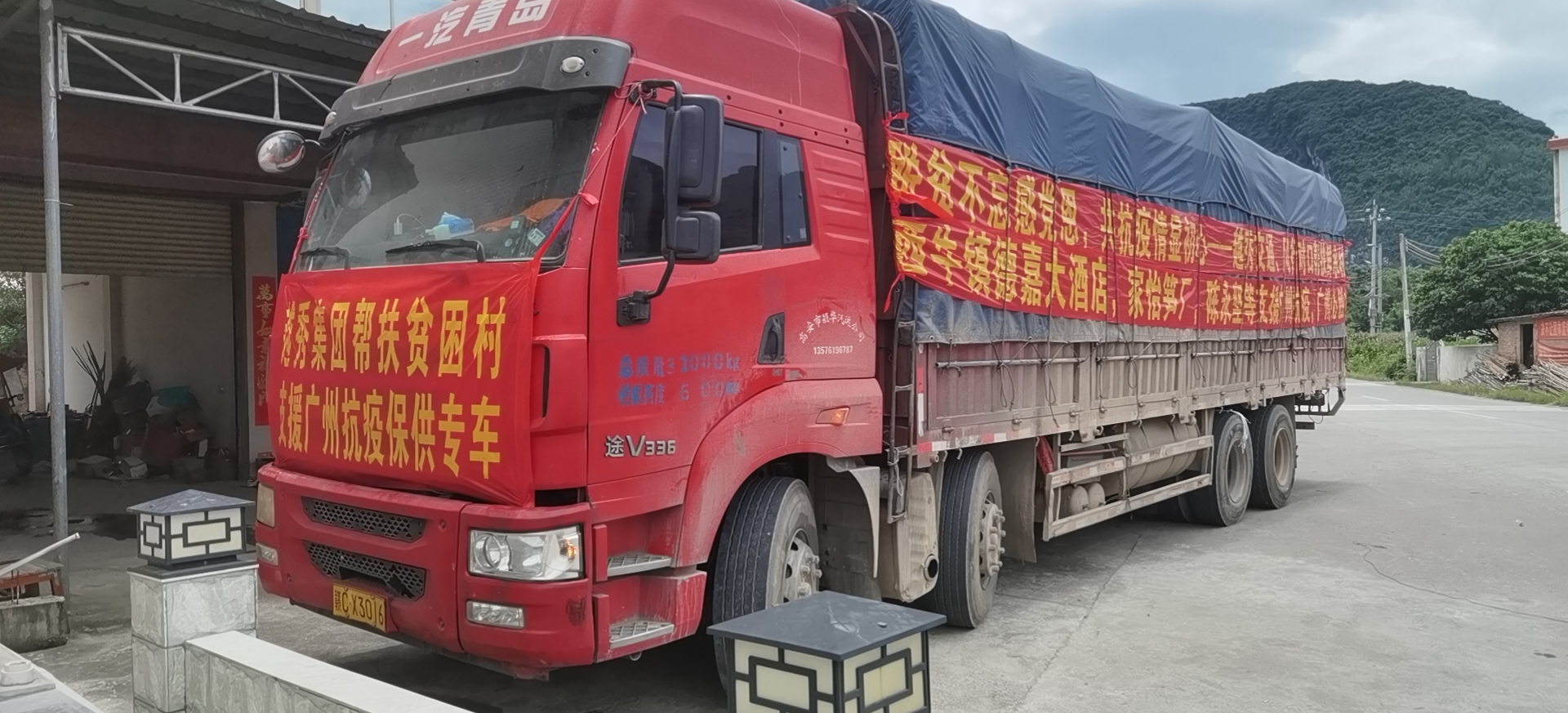昔日你帮我,今日我撑你!清远英德市西牛镇赤米、高道、鲜水村三个村村委自发筹集抗疫生活物资驰援广州,此次捐赠的物资有冬瓜3万斤,即食笋100箱,鲜泉大米30箱,养肝草100袋,茄子1万斤,价值约9万元,这批捐赠物资抵达广州后,将按照广州市驻清远市扶贫工作队的统筹安排,通过集团下属风行食品板块及时供给广州市封闭隔离区的居民。