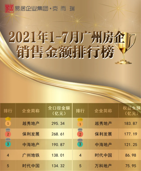8月6日,克而瑞独家发布《2021年1-7月广州房企销售榜》,越秀地产以亮眼业绩表现再次斩获权益金额榜、全口径金额榜双料第一。